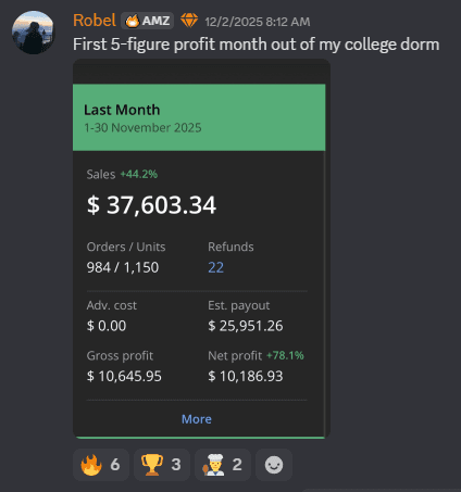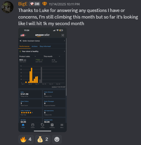 "Month two and already breaking past my first milestones. The guidance gave me the exact structure I was missing. From product selection to listing optimization, everything became clear. Result: my first profitable month without the chaos.