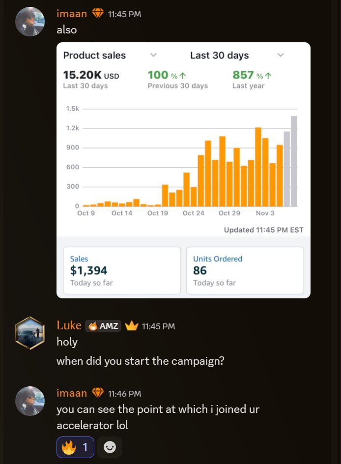 "My sales doubled the moment I joined the accelerator You can literally see on the chart where I joined the accelerator. My last 30 days hit 15.2K, up 100%, and sales keep climbing every day.